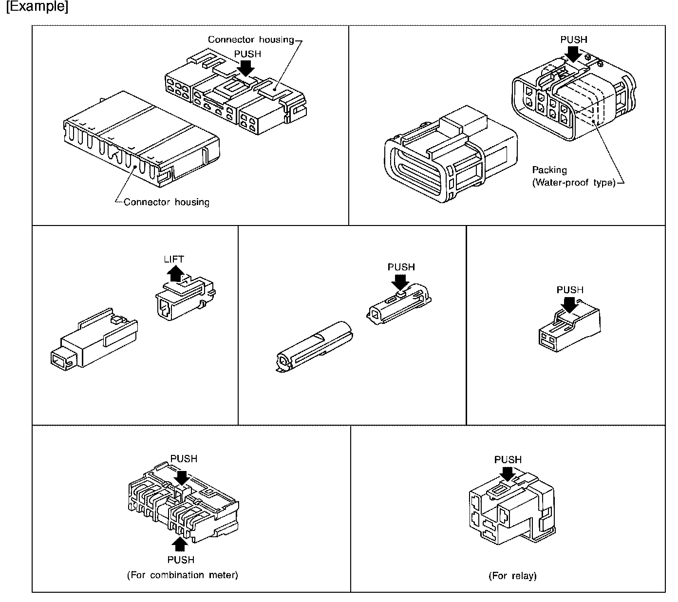- The tab-locking type connectors are disconnected by pushing or lifting the locking tab(s). Refer to the illustration.