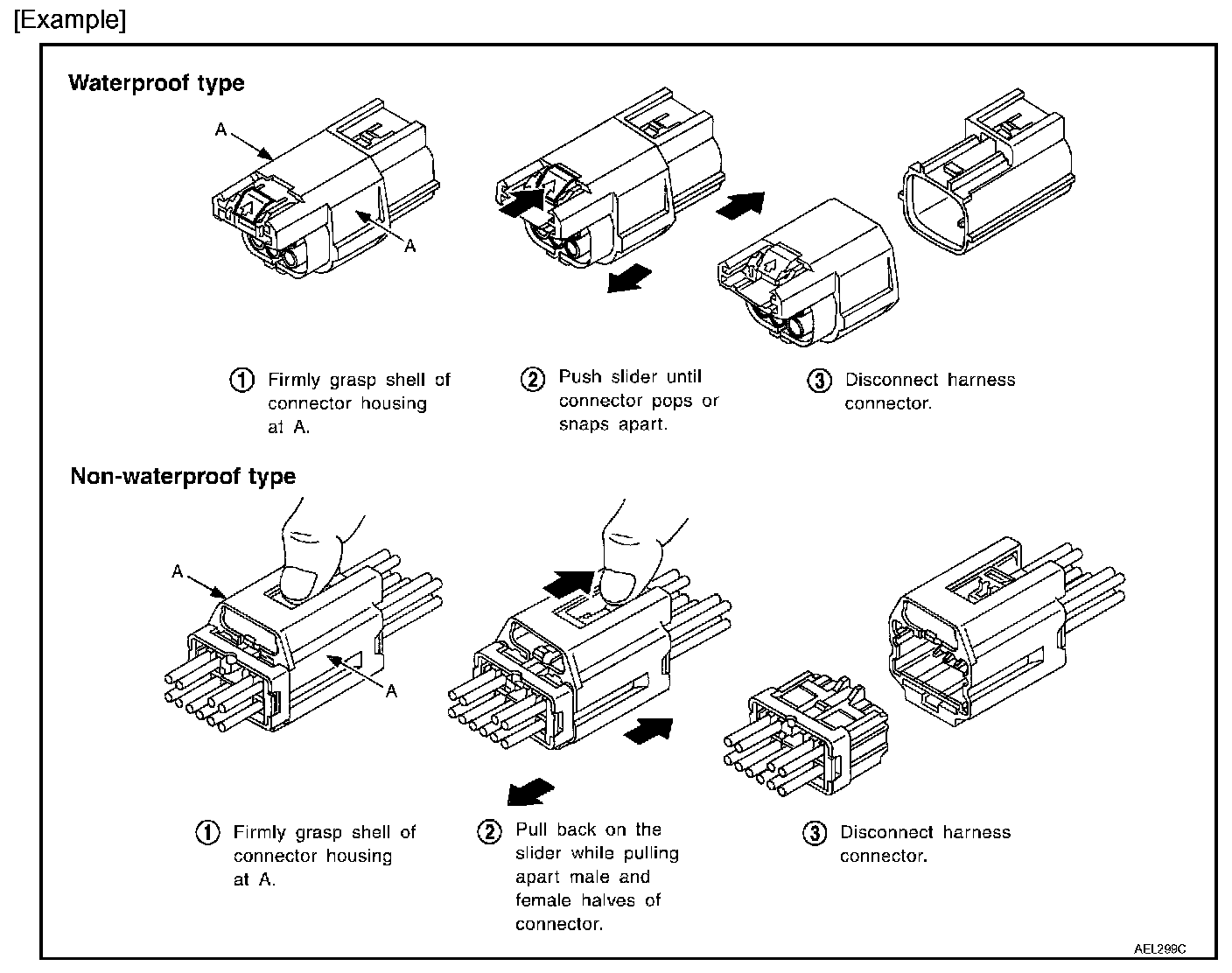 - The slide-locking type connectors are disconnected by pushing or pulling the slider. Refer to the illustration.