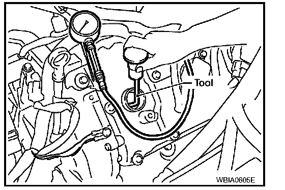 6. With the accelerator pedal fully depressed, turn the ignition switch to "START" for cranking. When the gauge pointer stabilizes, read the compression pressure and engine rpm. Perform these steps to check each cylinder.