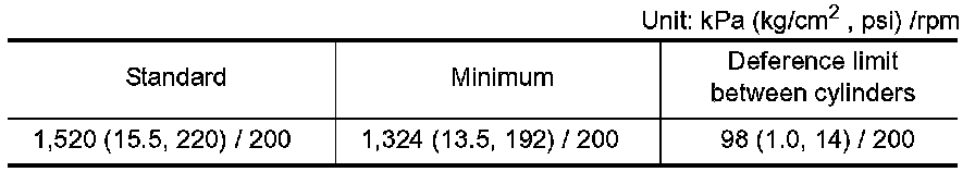 ^ If the compression pressure is below the minimum value, check the valve clearances and parts associated with the combustion chamber (valve, valve seat, piston, piston ring, cylinder bore, cylinder head, cylinder head gasket). After checking, measure the compression pressure again.