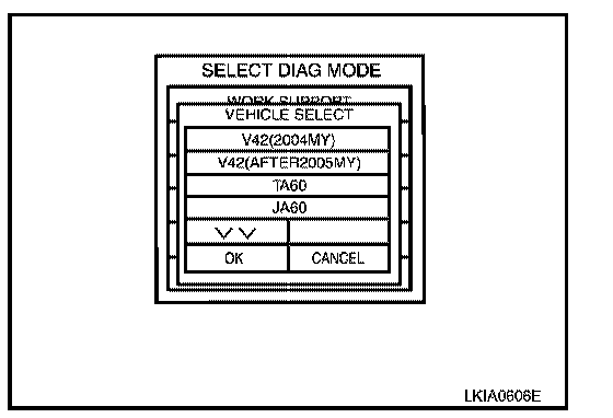 6. Touch "JA60" and "OK" on "VEHICLE SELECT" screen. For canceling, touch "CANCEL" on "VEHICLE SELECT" screen.