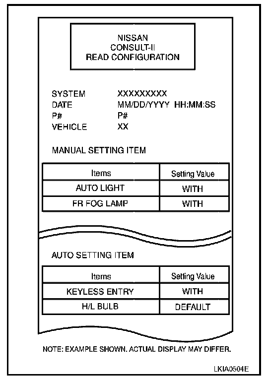 8. Configuration of current BCM is printed out automatically. A listing of manual setting items and auto setting items will be displayed. Auto setting items are preset and cannot be changed. Manual setting items can be set by using WRITE CONFIGURATION PROCEDURE. Refer to "WRITE CONFIGURATION PROCEDURE".
