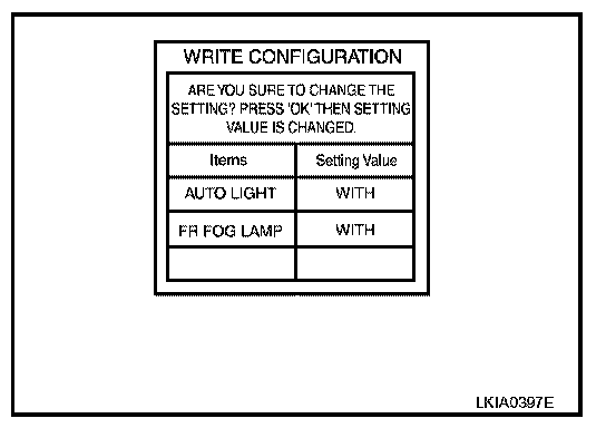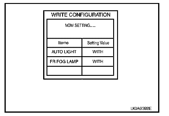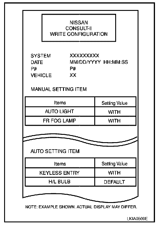 - Depending on CONSULT-II software version being used, some or all of the write configuration items shown in the following configuration lists may be displayed. If an item does not appear on the CONSULT-II "WRITE CONFIGURATION" screen(s), then it is an auto setting item and it cannot be manually set or changed.