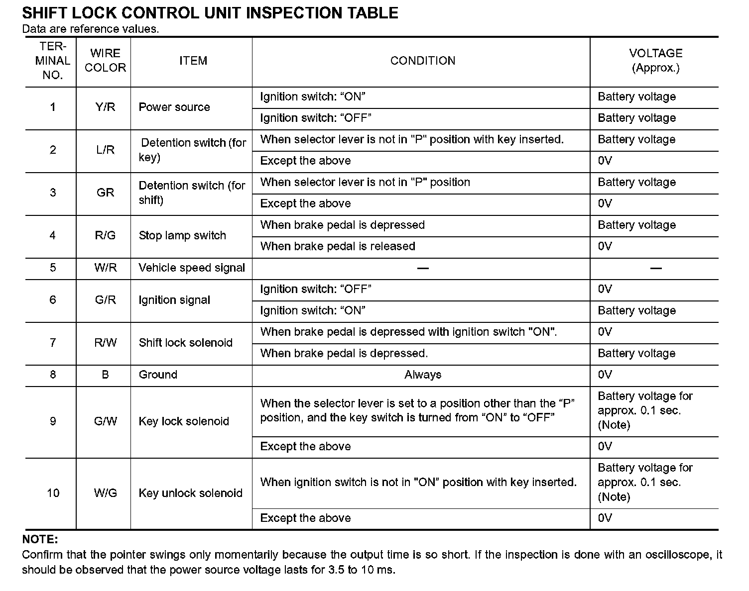 SHIFT LOCK CONTROL UNIT INSPECTION TABLE: