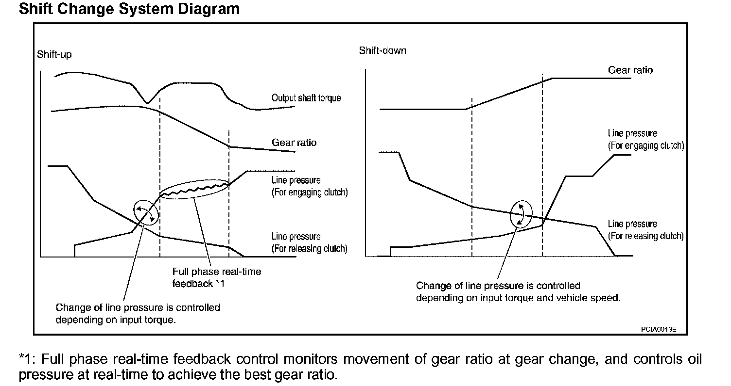 Shift ControlThe clutch pressure control solenoid is controlled by the signals from the switches and sensors. Thus, the clutch pressure is adjusted to be appropriate to the engine load state and vehicle driving state. It becomes possible to finely control the clutch hydraulic pressure with high precision and a smoother shift change characteristic is attained.