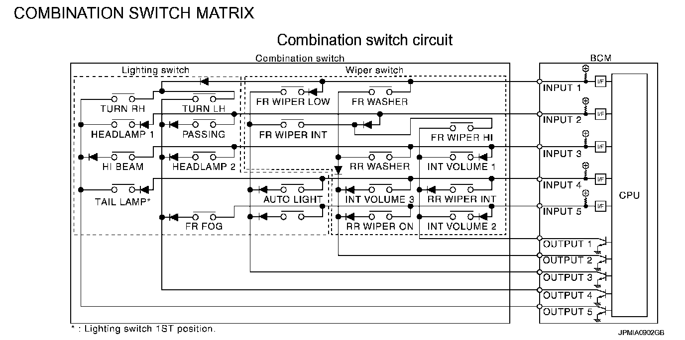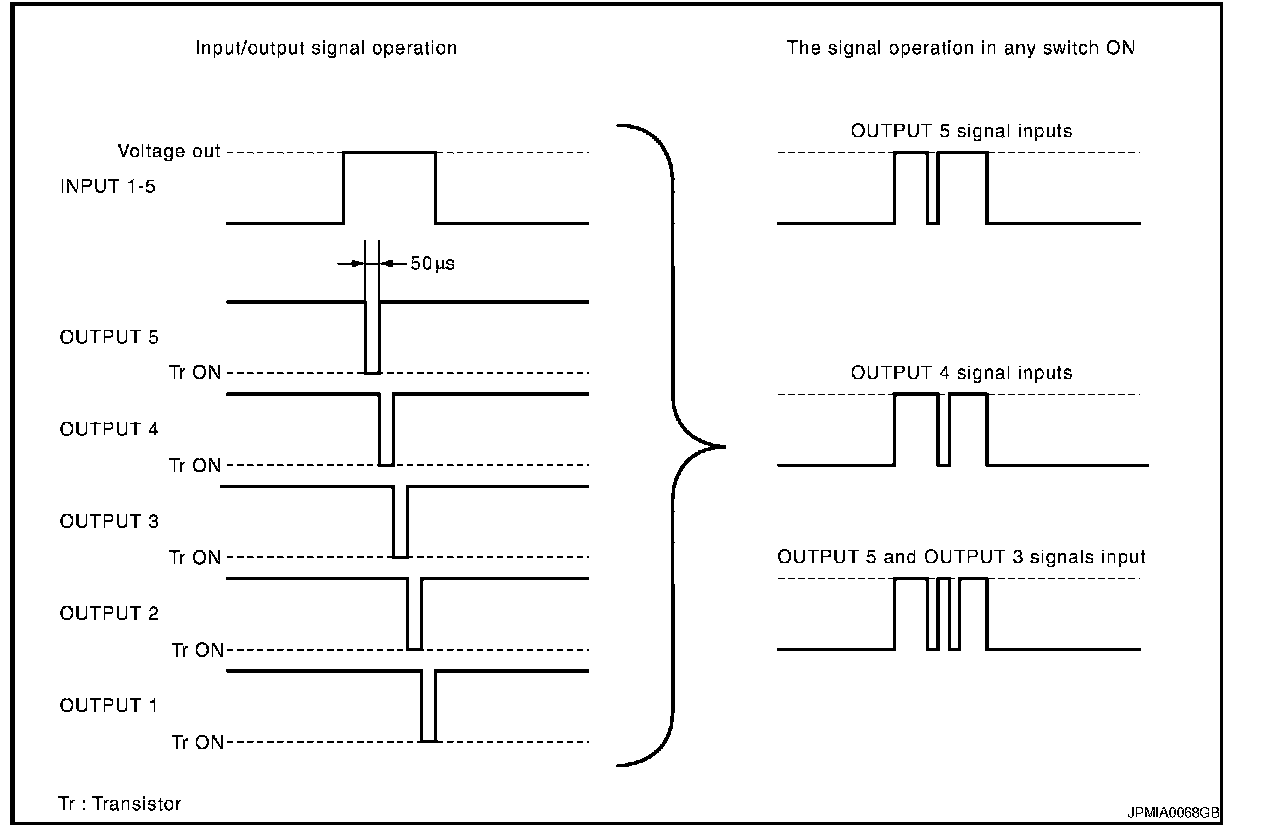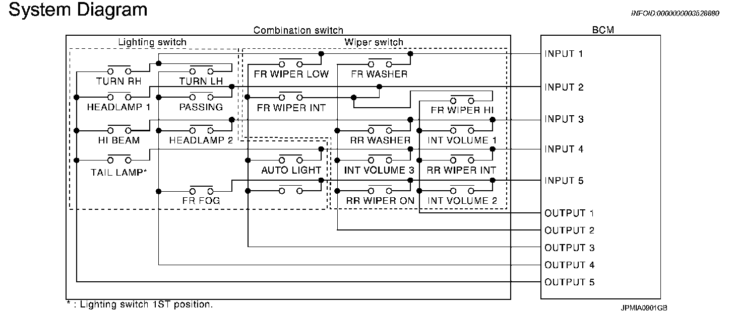- BCM detects the combination switch status signal "1CE" when the signals of OUTPUT 3 and OUTPUT 5 are input to INPUT 1.