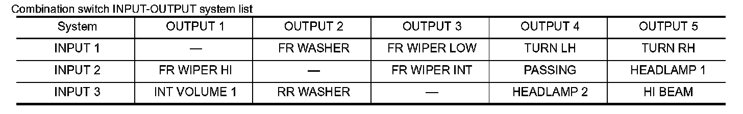 - The circuits between INPUT 1 and OUTPUT 5 and between INPUT 1 and OUTPUT 3 are formed when the TURN RH switch and FR WIPER LOW switch are turned ON.