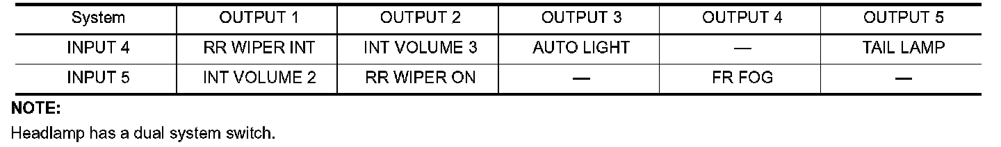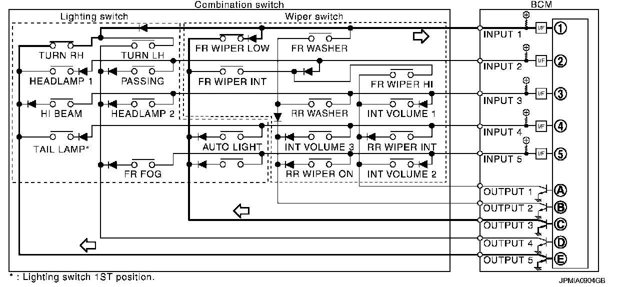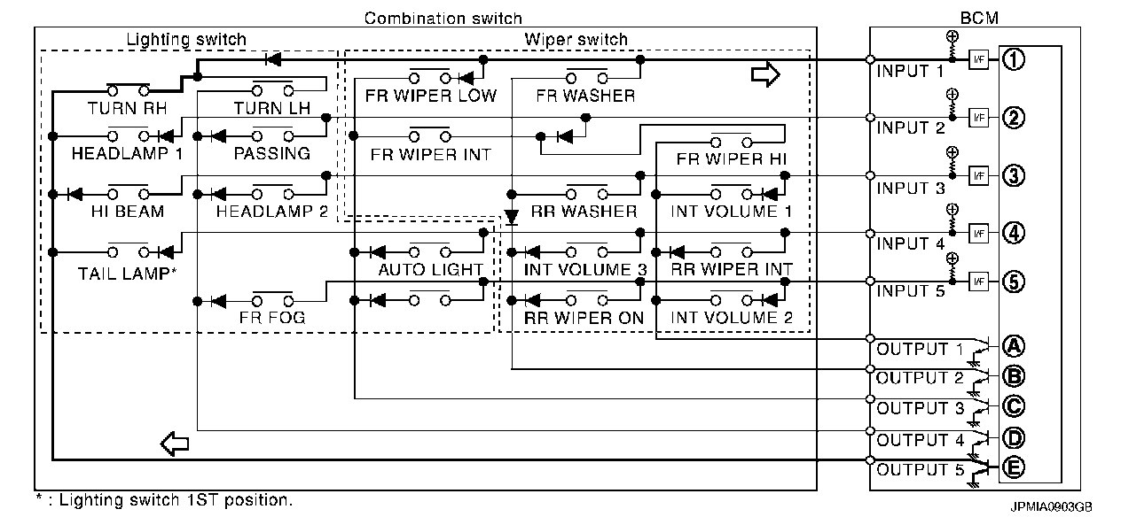 - BCM detects the combination switch status signal "1E" when the signal of OUTPUT 5 is input to INPUT 1.