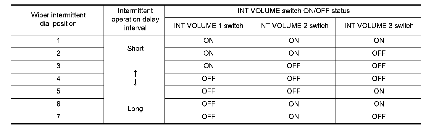 BCM judges the wiper intermittent dial 1 - 7 by the status of INT VOLUME 1, 2 and 3 switches.