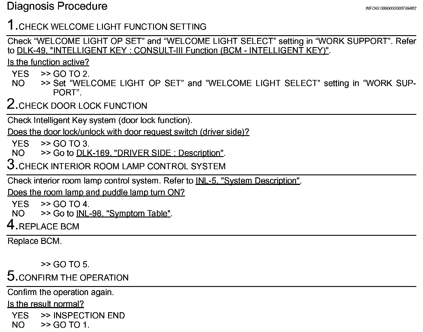 - All operation conditions are satisfied. Refer to DLK-32, "WELCOME LIGHT FUNCTION : System Description". Welcome Light Function