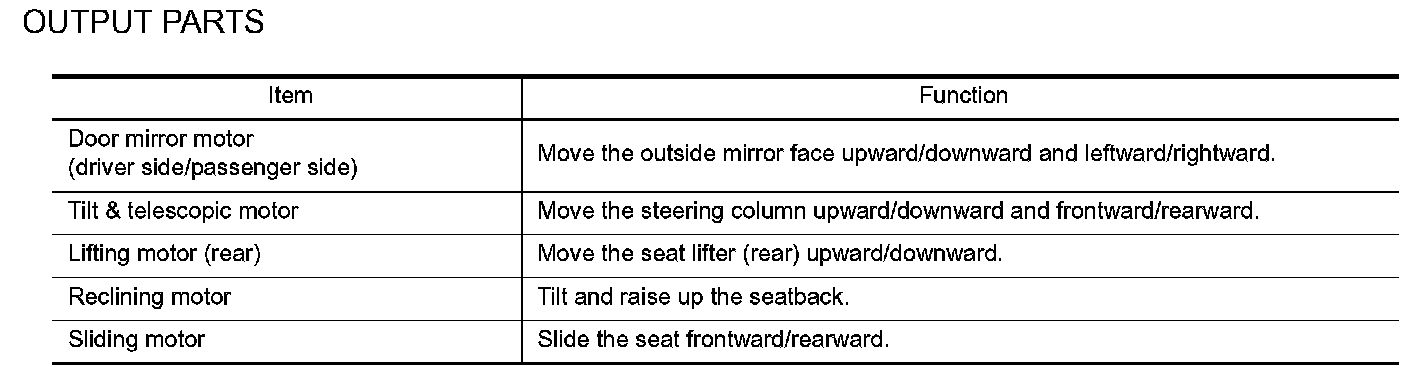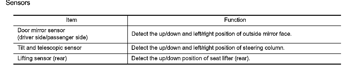 The steering column position and door mirror position is adjusted to the position automatically according to the direction and distance of seat movement when performing the manual operation of sliding, reclining or lifting (rear). This function saves adjusting the mirror and steering column when adjusting the seat.