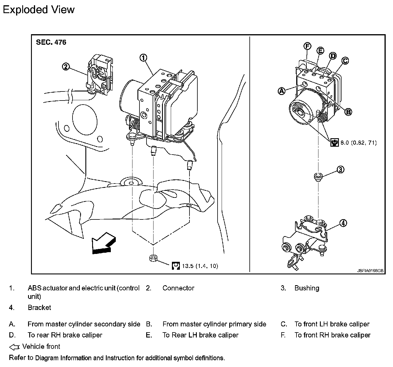 ^ When replacing ABS actuator and electric unit (control unit), make sure to adjust neutral position of steering angle sensor. Refer to BRC-8, "ADJUSTMENT OF STEERING ANGLE SENSOR NEUTRAL POSITION: Description". Testing and Inspection