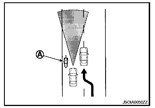 - The sensor detection distance is limited if the vehicle-to-vehicle distance is close. The vehicle distance may not maintain properly because the motorcycle (A) driving on the lane edge is not detected or the detection of the vehicle ahead (cutting in the own vehicle) delays.