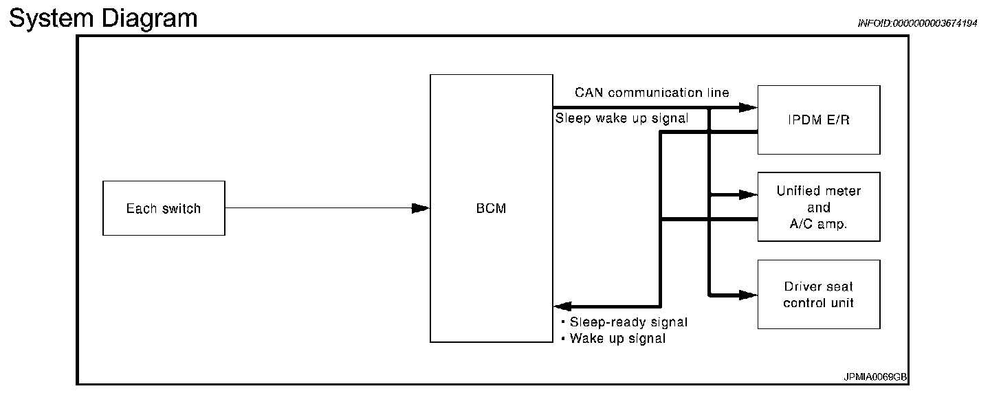 - IPDM E/R changes from the low power consumption mode to the normal mode when it receives a sleep wake-up signal (wake up) from BCM or any of the following conditions is fulfilled. In addition, it transmits a sleep-ready signal (not-ready) to BCM via CAN communication to report the CAN communication start.