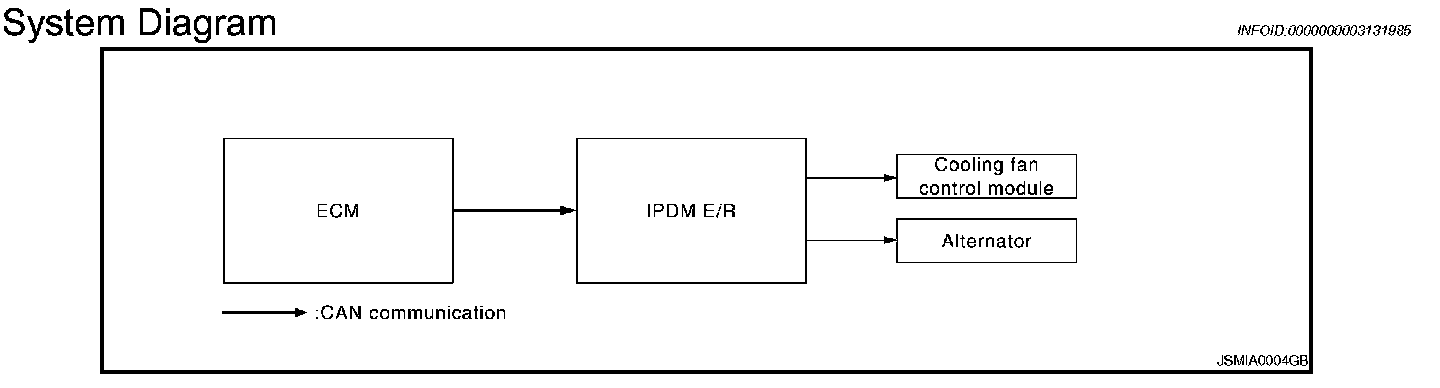 IPDM E/R outputs power generation command signal (PWM signal) to the alternator according to the status of the power generation command value signal received from ECM via CAN communication. Refer to "System Diagram".