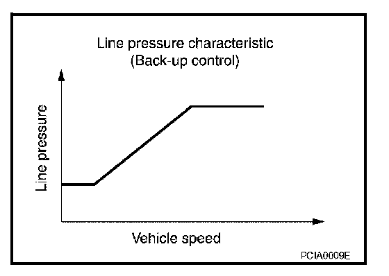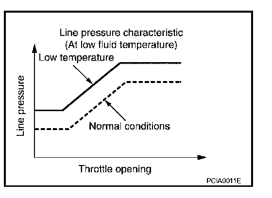 ^ When the A/T fluid temperature drops below the prescribed temperature, in order to speed up the action of each friction element, the line pressure is set higher than the normal line pressure characteristic.