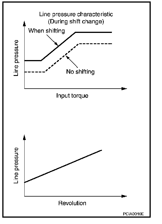 ^ The necessary and adequate line pressure for shift change is set. For this reason, line pressure pattern setting corresponds to input torque and gearshift selection. Also, line pressure characteristic corresponds to engine speed, during engine brake operation.