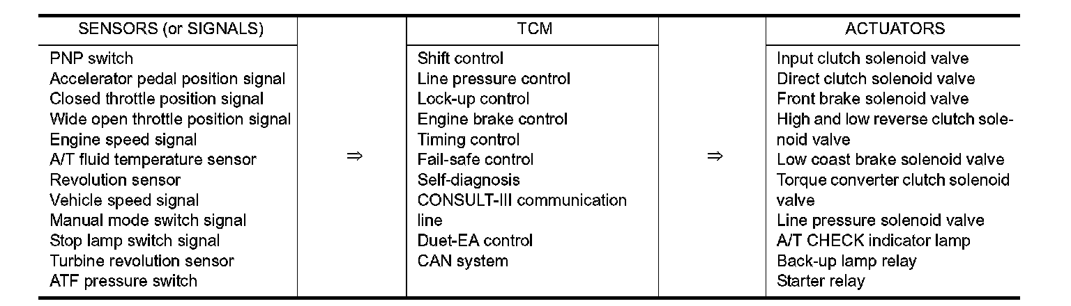 System DescriptionThe A/T senses vehicle operating conditions through various sensors or signals. It always controls the optimum shift position and reduces shifting and lock-up shocks.