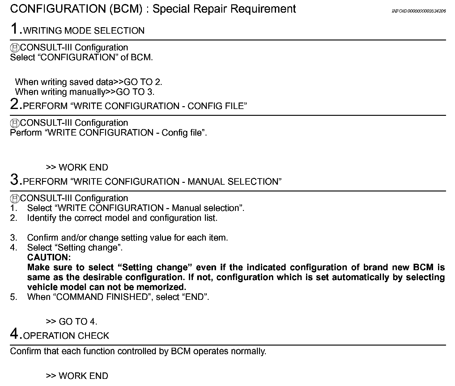 - When replacing BCM, you must perform "WRITE CONFIGURATION" with CONSULT-III.