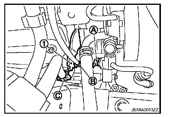 4. Remove the clip (B) from the harness bracket (1) and "B" terminal harness from the clip (C).