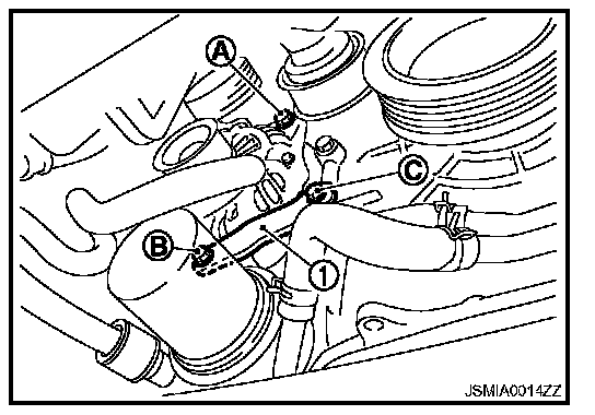 8. Remove alternator mounting bolt (B) and alternator stay mounting bolt (C) using power tools, then remove alternator stay (1).