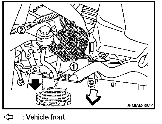 14. Move a power steering pump (1) and reservoir tank (2) forward.