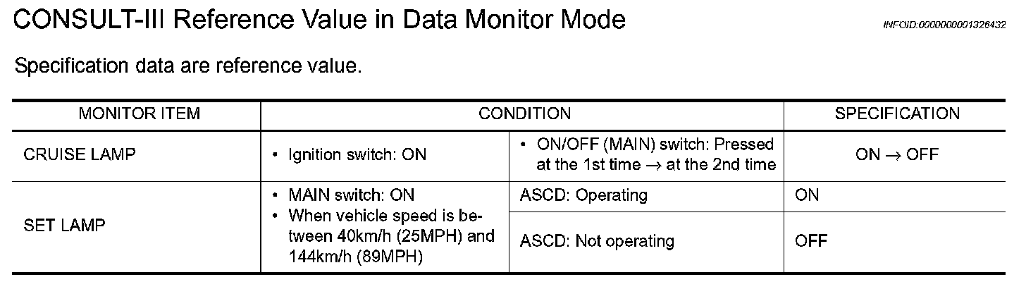 - SET/COAST switch on ASCD steering switch is turned ON while vehicle speed is within the range of ASCD setting.