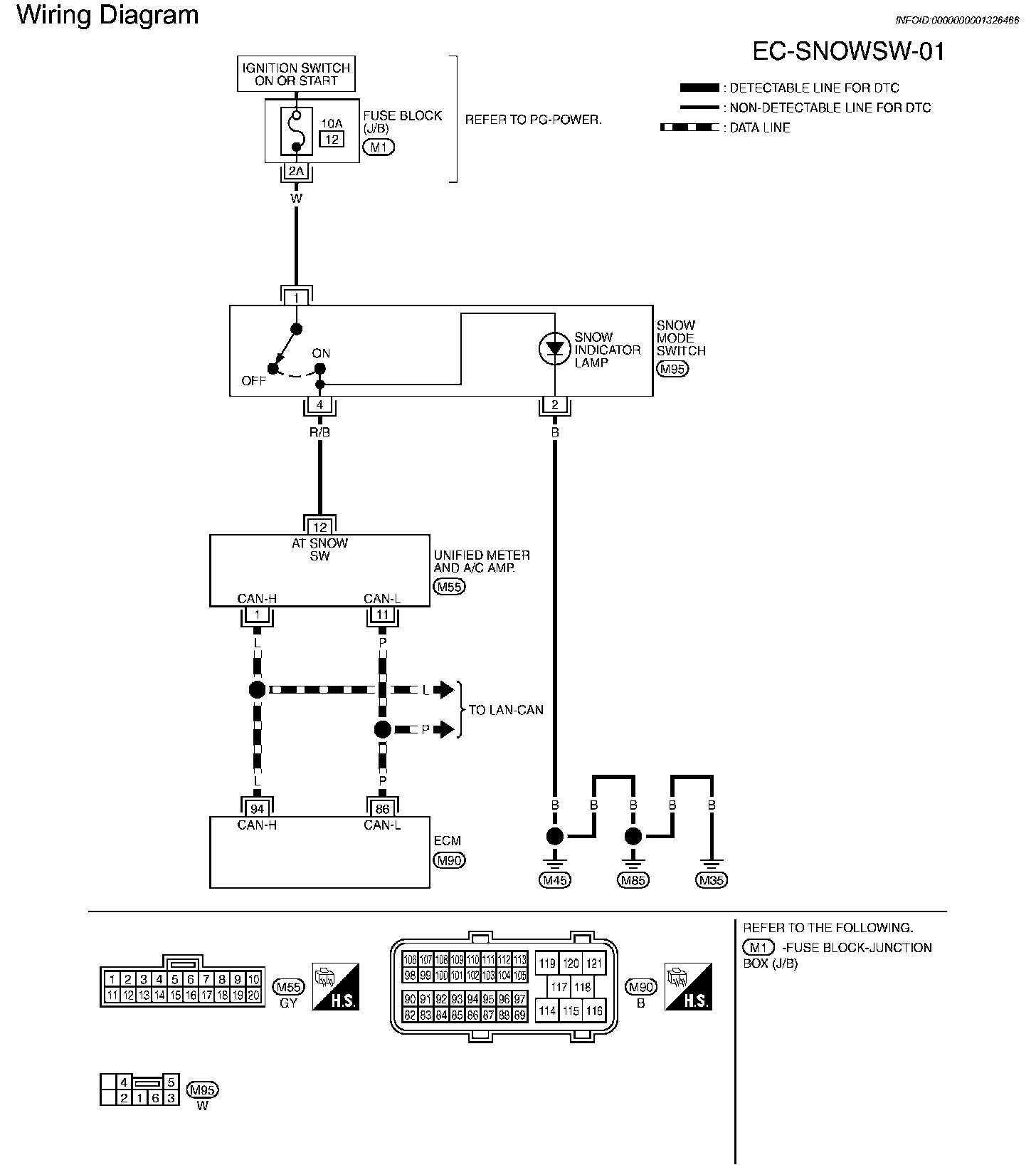 The snow mode switch signal is sent to the "unified meter and A/C amp." from the snow mode switch. The "unified meter and A/C amp." then sends the signal to the ECM by CAN communication line.