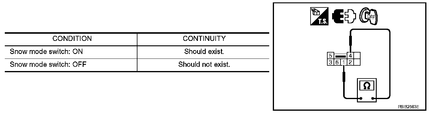 1. Check continuity between snow mode switch terminals 1 and 4 under the following conditions.