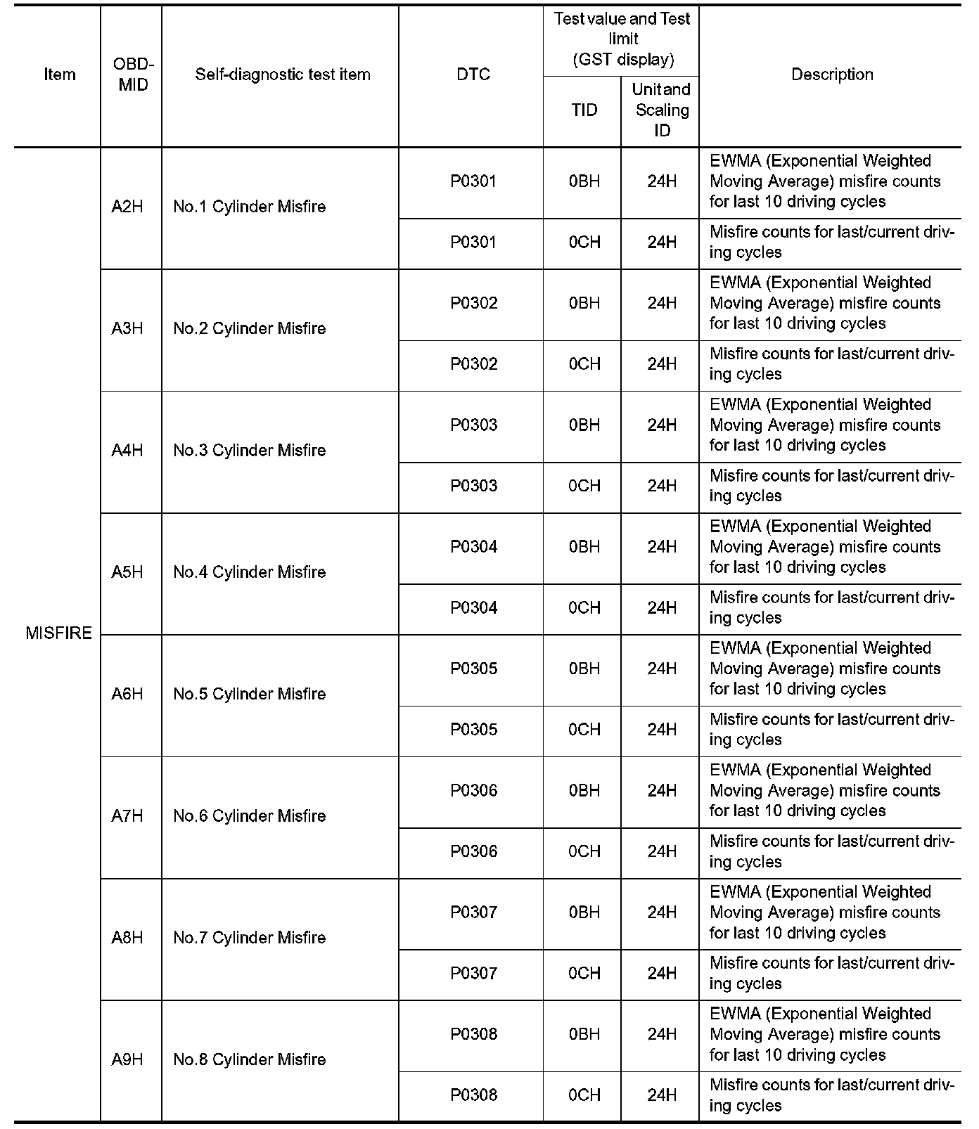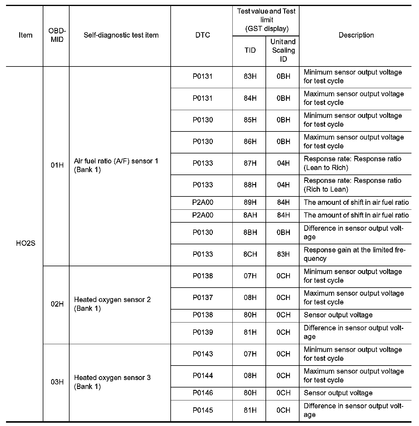 These data (test value and test limit) are specified by On Board Monitor ID(OBDMID), Test ID (TID), Unit and Scaling ID and can be displayed on the GST screen.