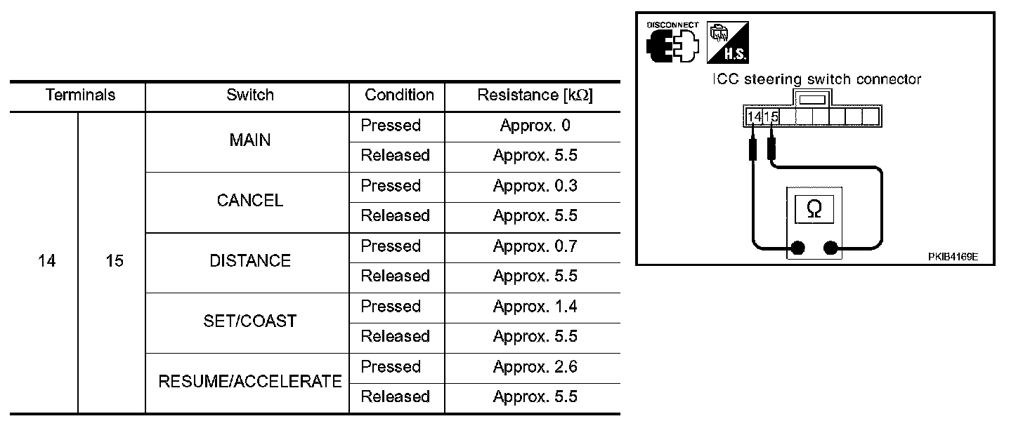 Check resistance between ICC steering switch connector terminals by pressing each switch.