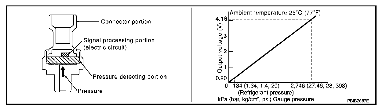 The refrigerant pressure sensor is installed at the condenser of the air conditioner system. The sensor uses an electrostatic volume pressure transducer to convert refrigerant pressure to voltage. The voltage signal is sent to ECM, and ECM controls cooling fan system.
