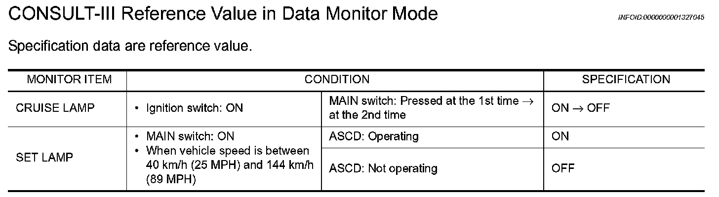 CRUISE lamp illuminates when MAIN switch on ASCD steering switch is turned ON to indicated that ASCD system is ready for operation.