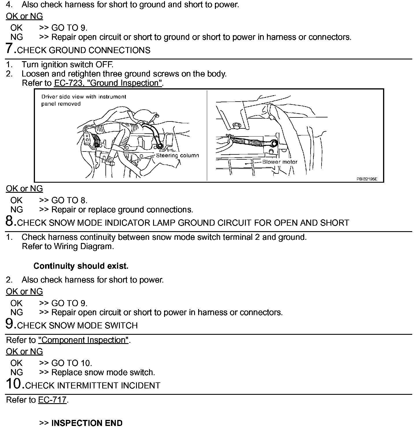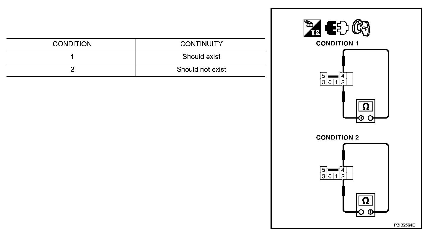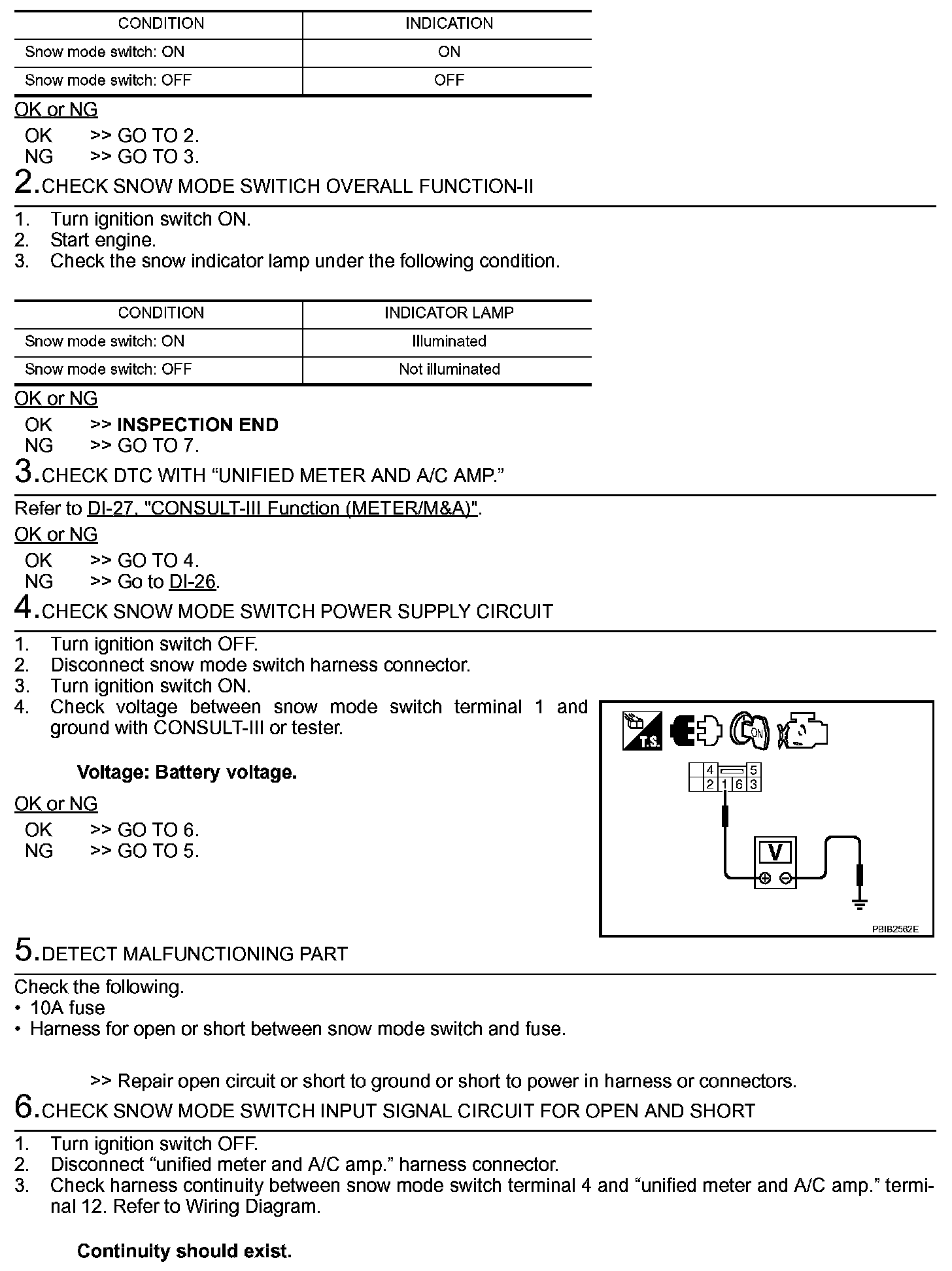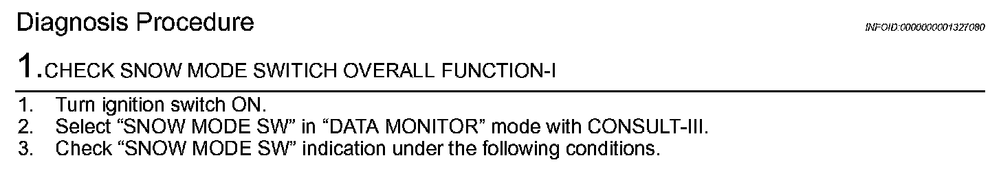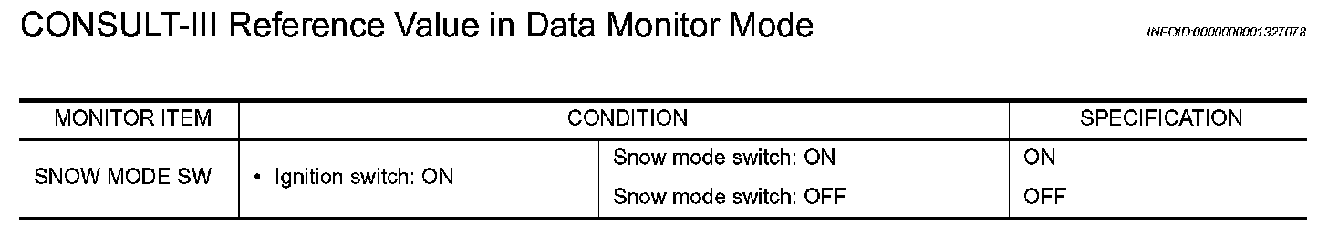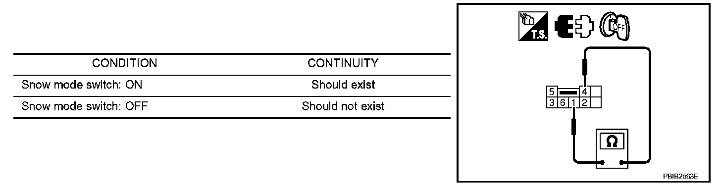 3. Check continuity between snow mode switch terminals 2 and 4 under the following conditions.