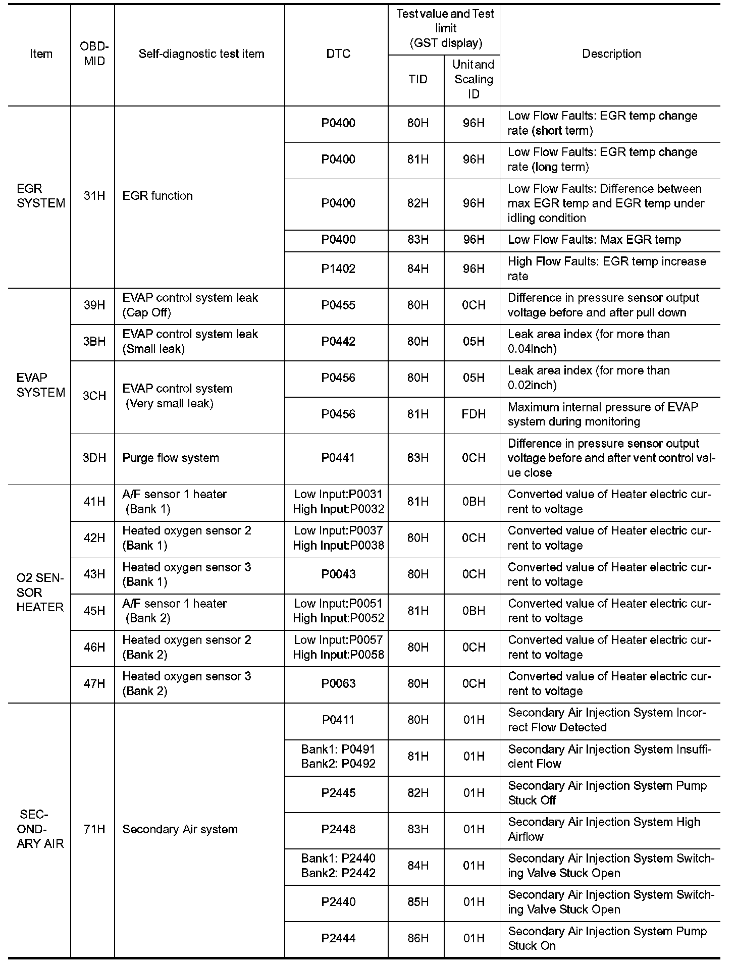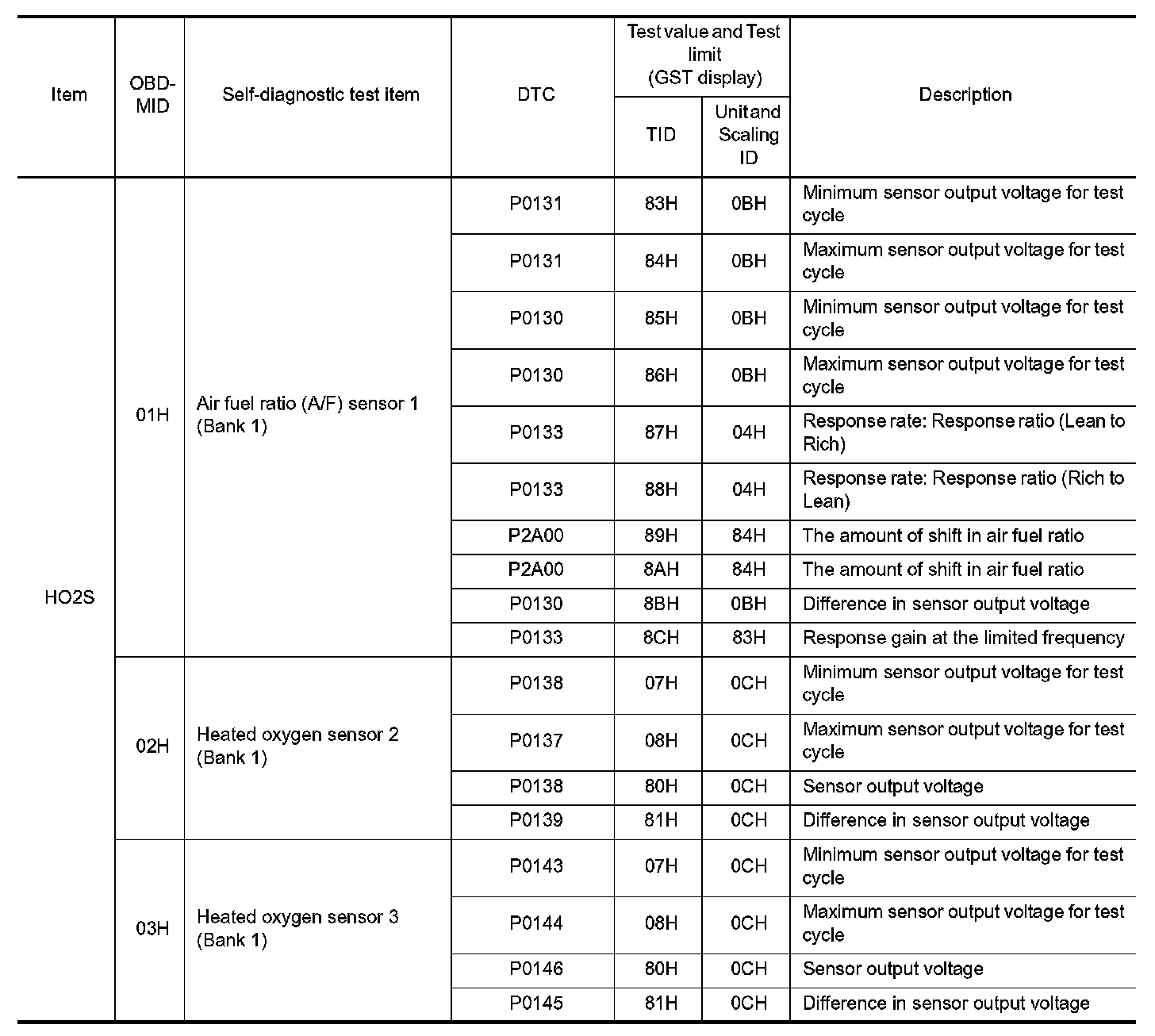 These data (test value and test limit) are specified by On Board Monitor ID(OBDMID), Test ID (TID), Unit and Scaling ID and can be displayed on the GST screen.