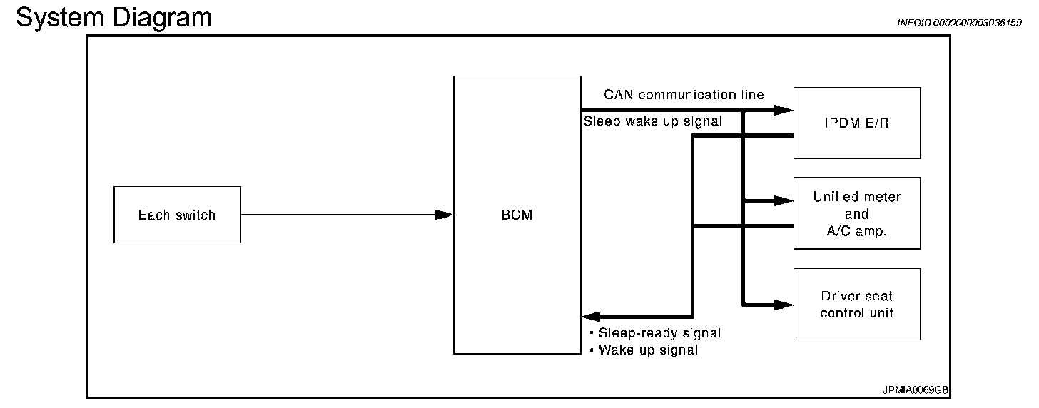- BCM receives the sleep-ready signal (ready) from IPDM E/R and unified meter and A/C amp. via CAN communication.