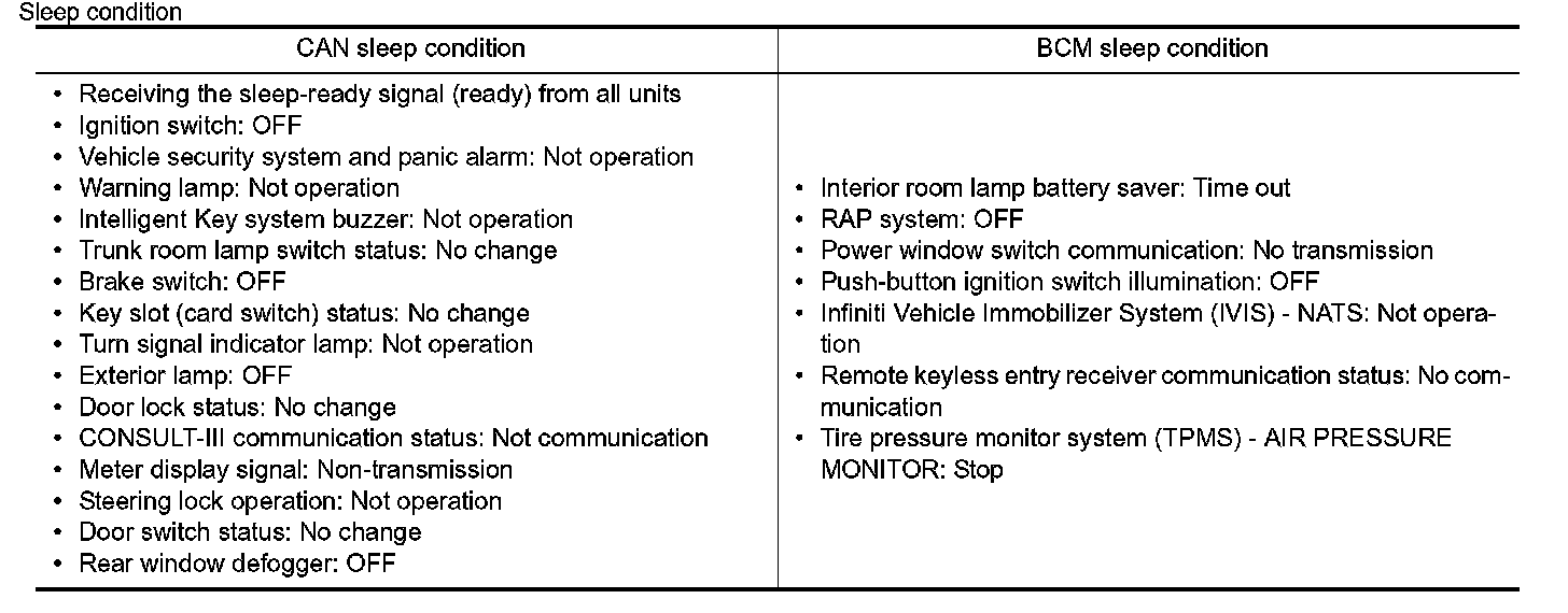 - BCM transmits the sleep wake up signal (sleep) to each unit when all of the CAN sleep conditions are fulfilled.