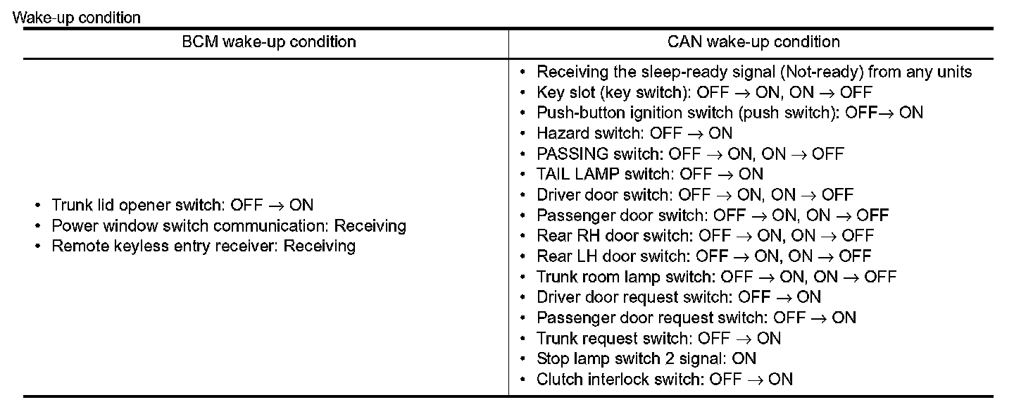 - BCM transmits the sleep wake up signal (wake up) to each unit when any of the CAN wake-up conditions is fulfilled. It changes from the low power consumption mode or the CAN communication sleep mode to the normal mode.