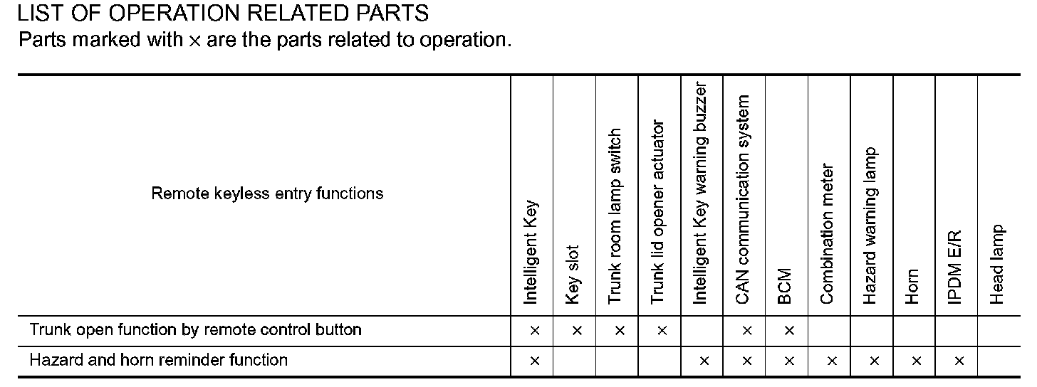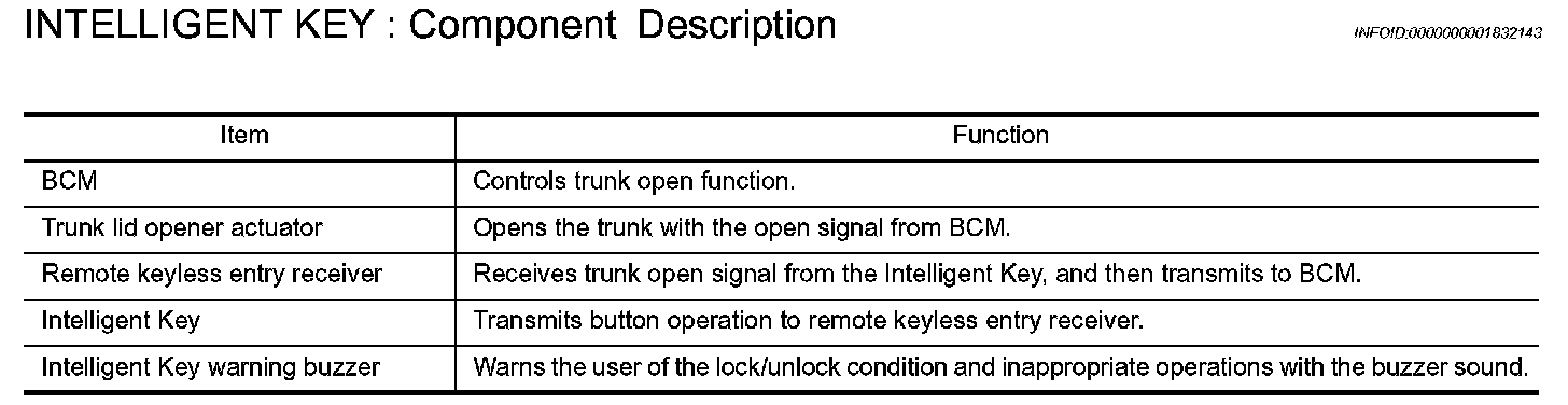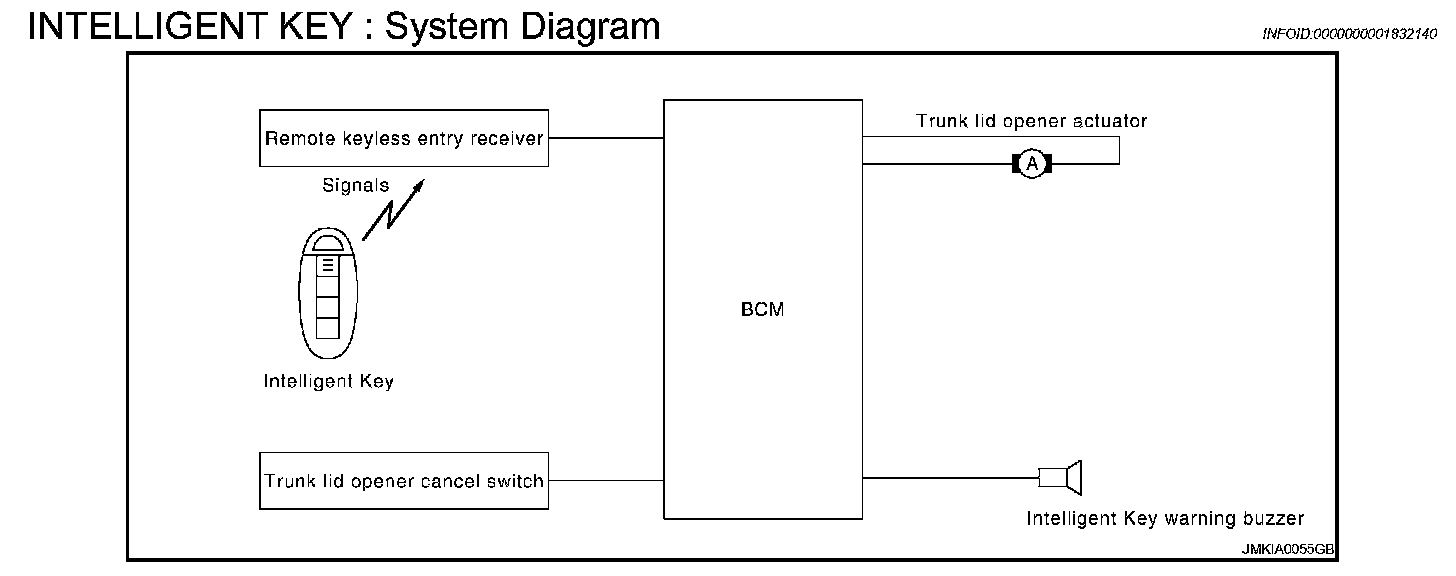 - When trunk button of the Intelligent Key is pressed, the trunk open signal is transmitted from the Intelligent Key to the BCM via remote keyless entry receiver.