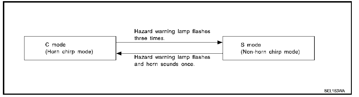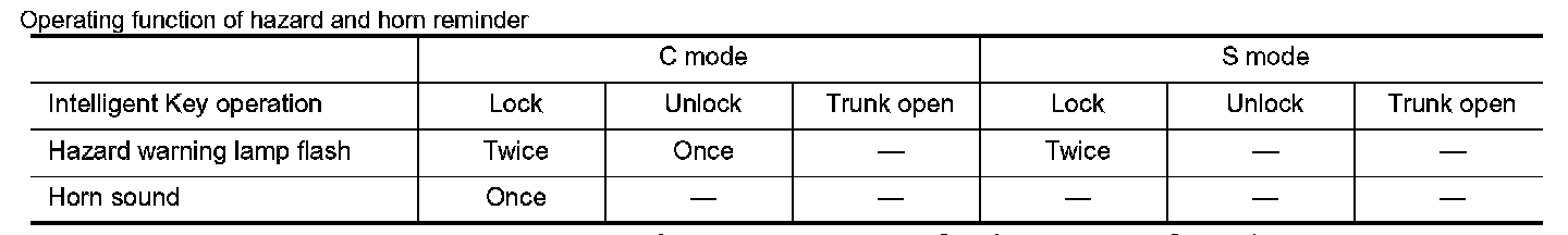 When LOCK and UNLOCK signals are transmitted from the Intelligent Key for more than 2 seconds at the same time, the hazard and horn reminder mode is changed and hazard warning lamp flashes and horn sounds as follows: