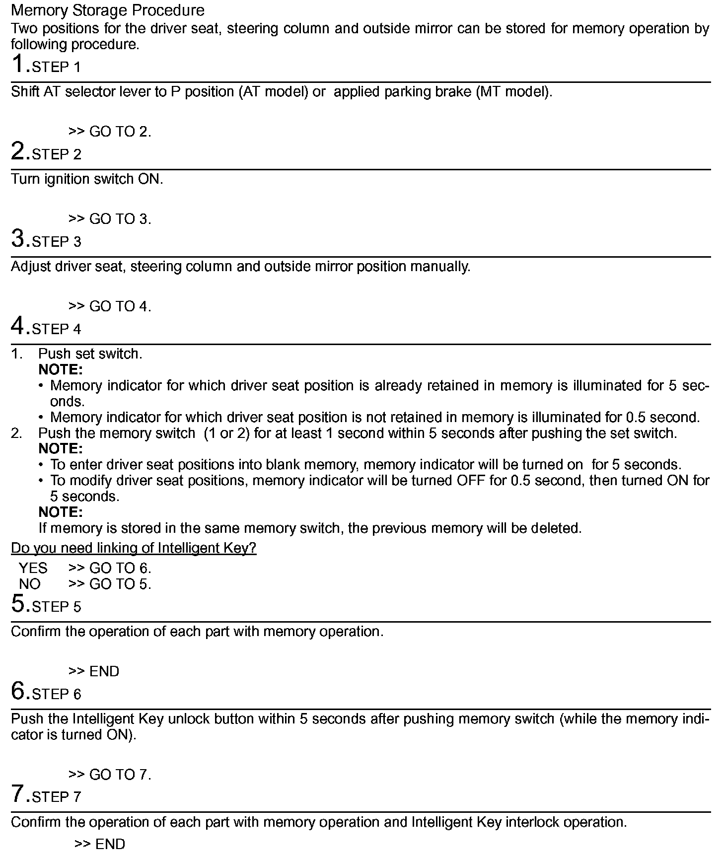 Always perform the memory storage when the battery terminal is disconnected or the driver seat control unit is replaced. The memory function and Intelligent Key interlock function will not operate normally if no memory storage is performed.