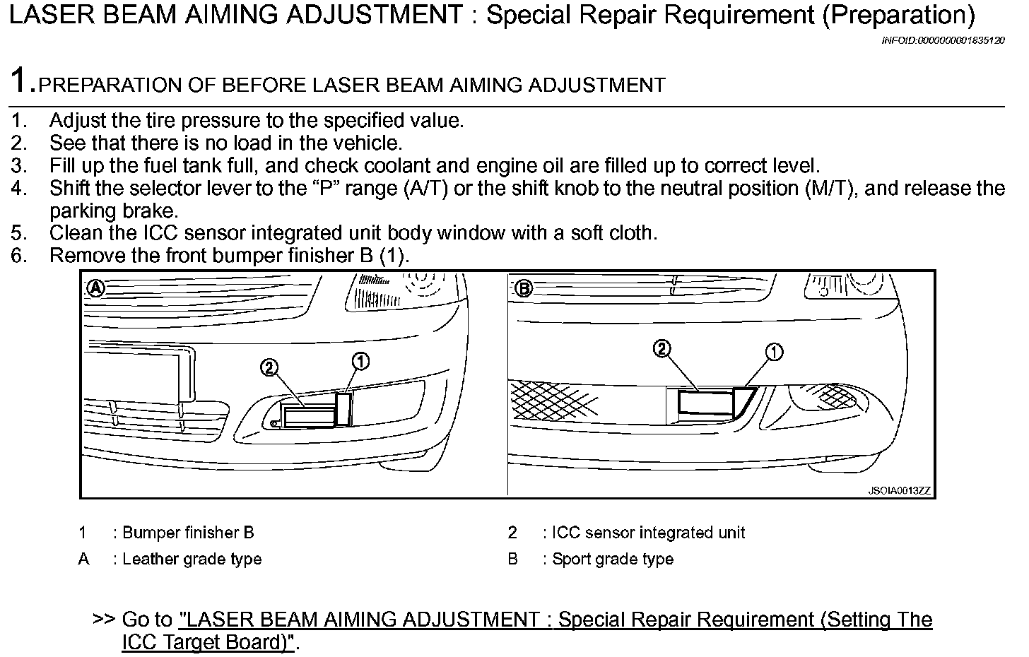 Adjust the laser beam aiming every time the ICC sensor integrated unit is removed or installed.