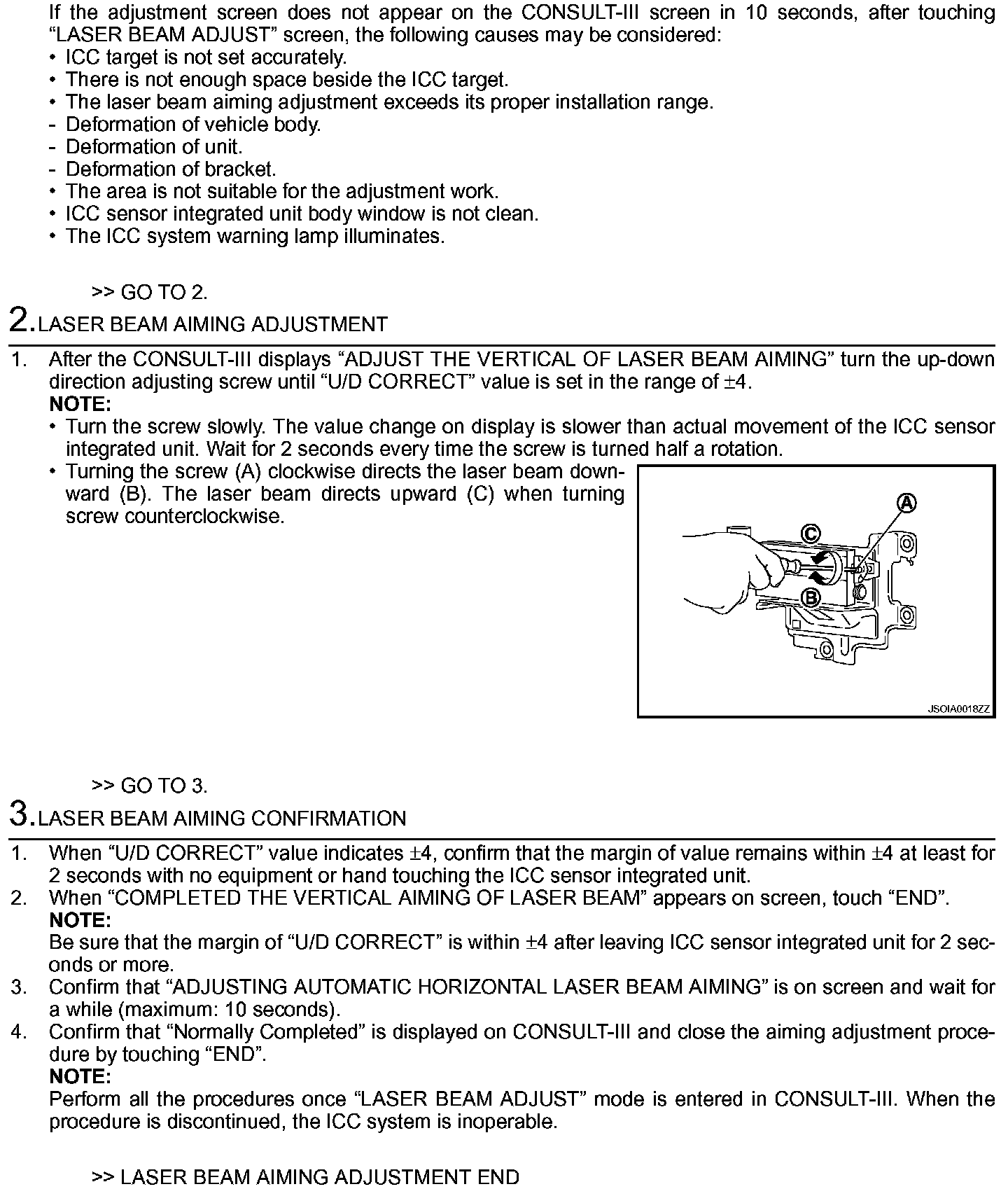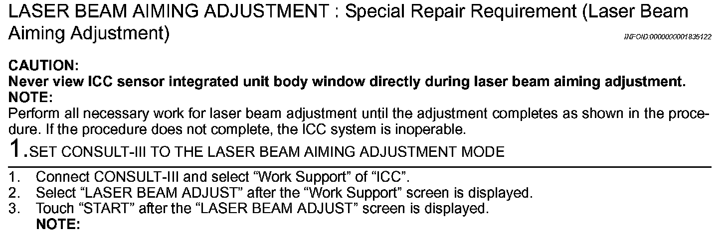 - Follow the CONSULT-III when adjusting the laser beam aiming (laser beam aiming adjustment cannot be operated without CONSULT-III).