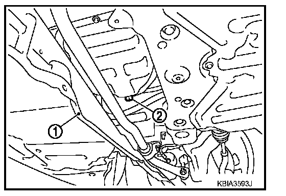 4. Remove mounting bolts, and then pull down the rear of front engine undercover (1) and secure it using clip.