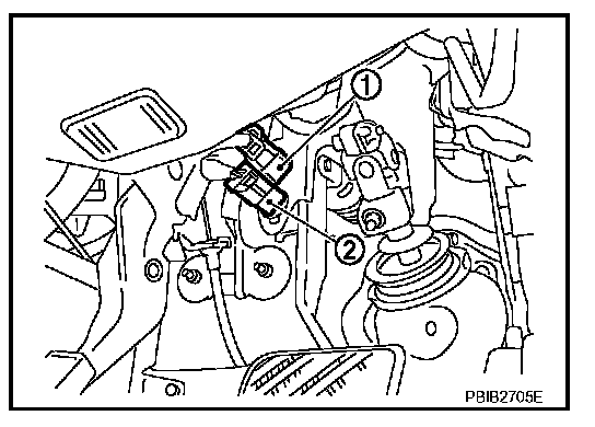 When the brake pedal is depressed, ASCD brake switch (2) is turned OFF and stop lamp switch (1) is turned ON. ECM detects the state of the brake pedal by this input of two kinds (ON/OFF signal).