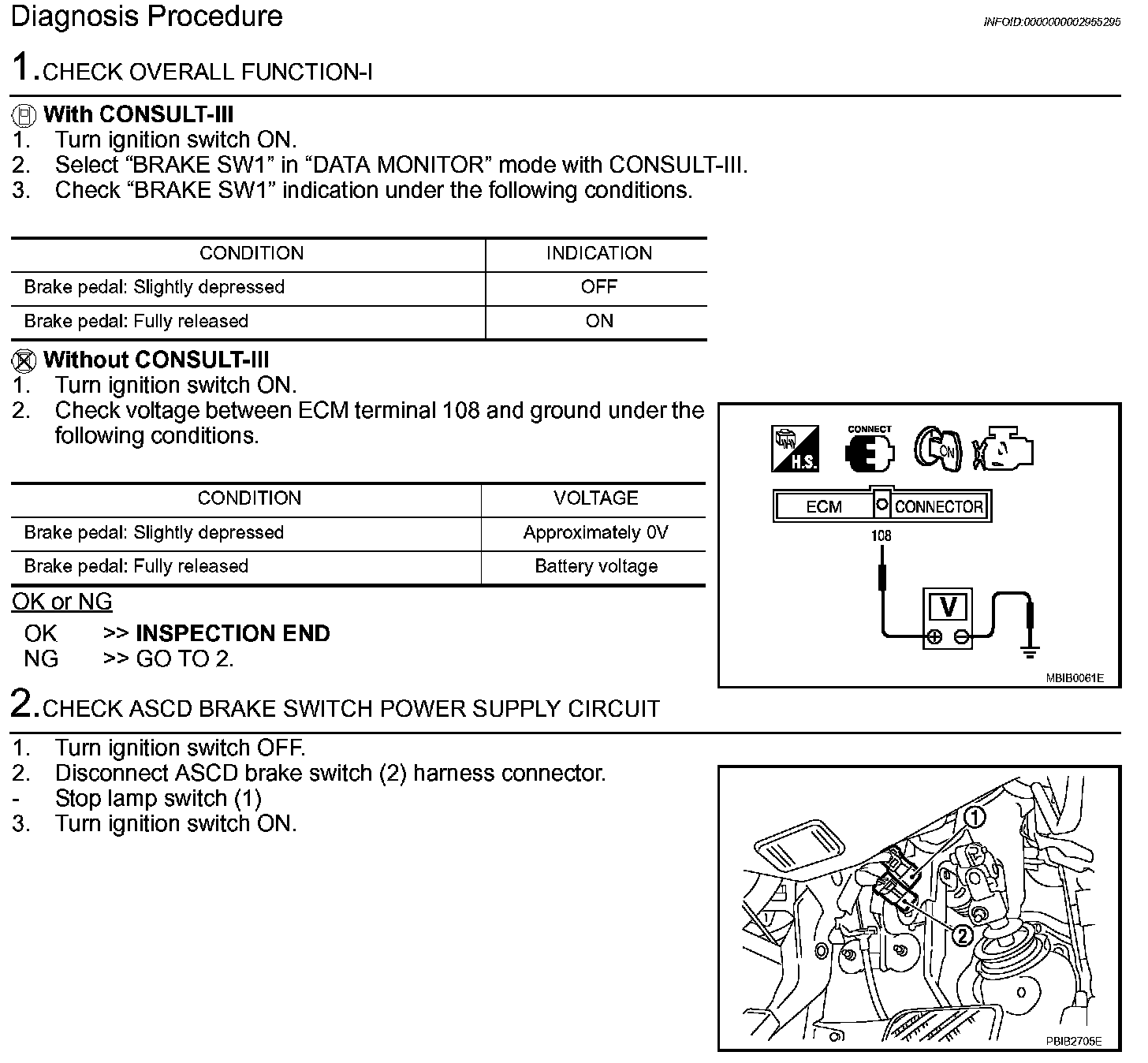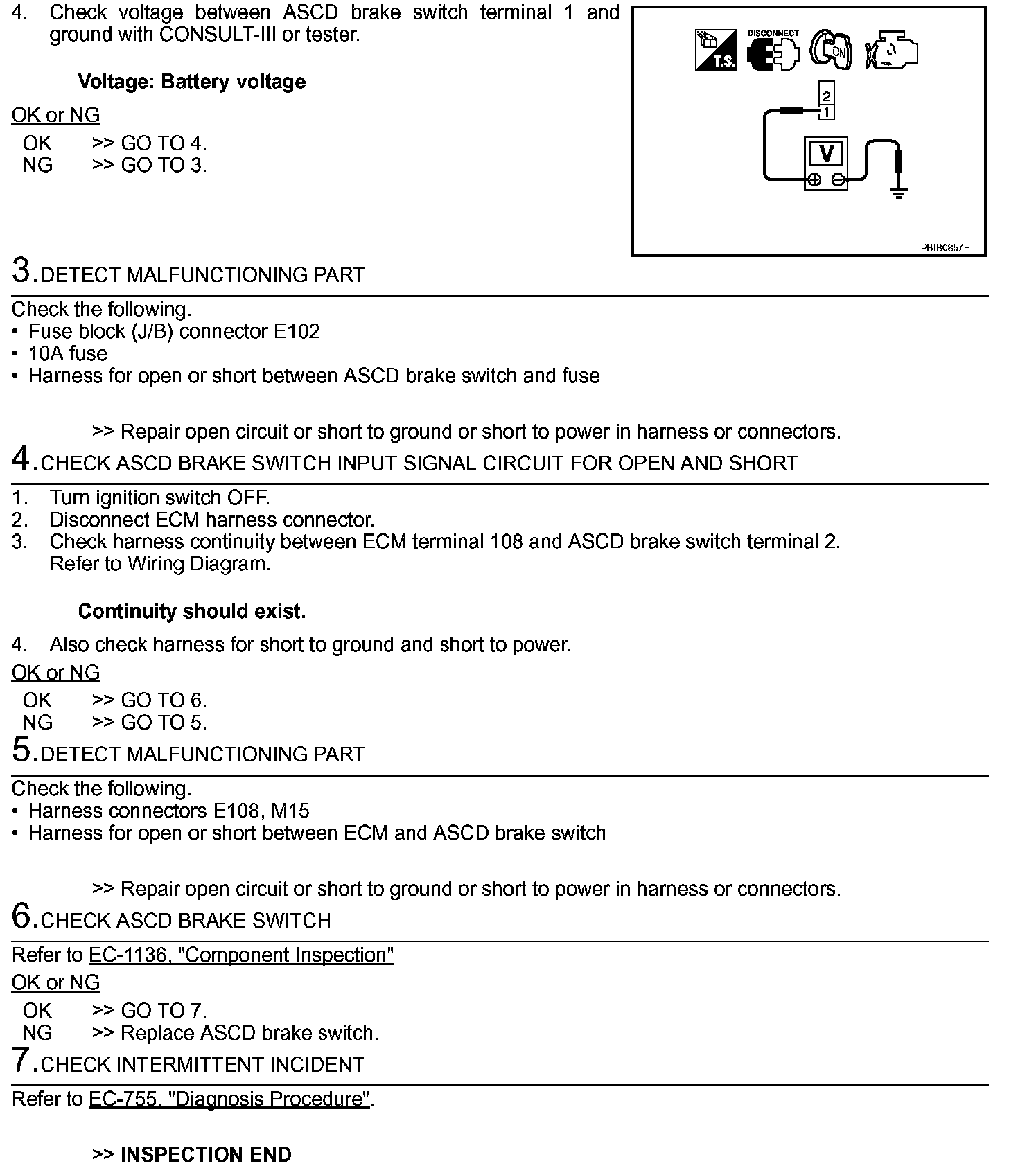 4. If NG, adjust ASCD brake switch installation, refer to BR-6, Adjustments and perform step 3 again.