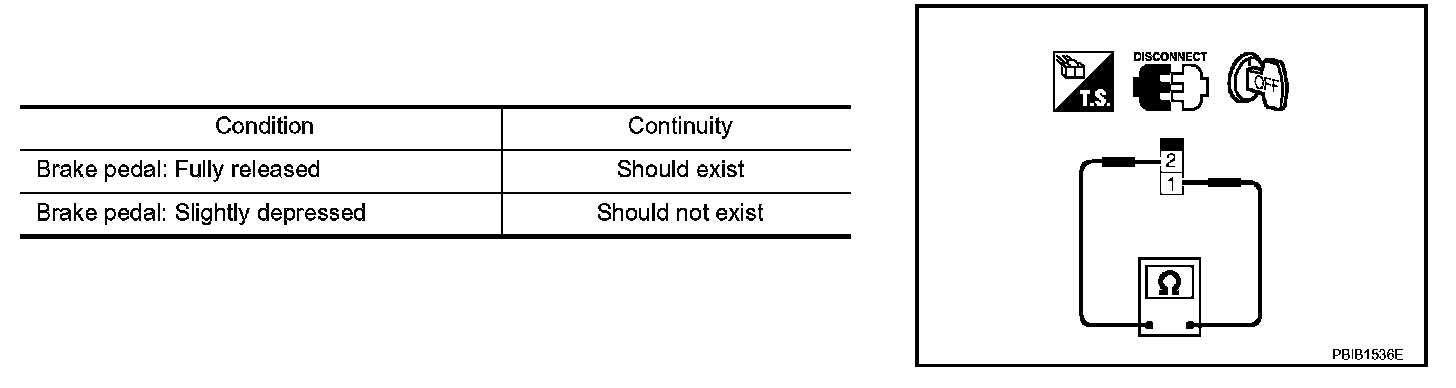 3. Check continuity between ASCD brake switch terminals 1 and 2 under the following conditions.