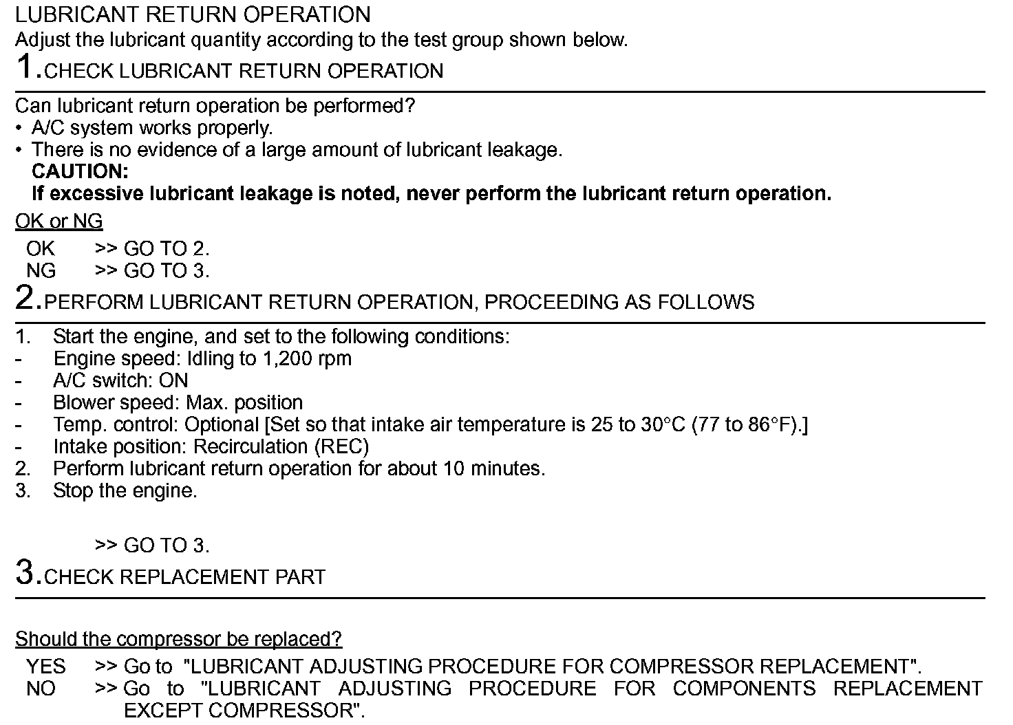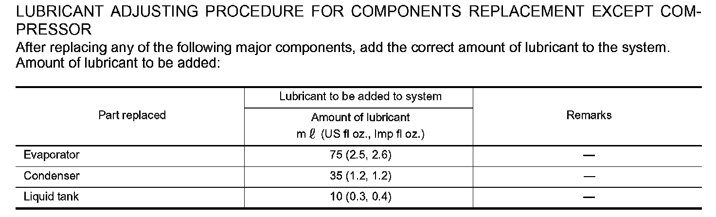 LUBRICANT ADJUSTING PROCEDURE FOR COMPONENTS REPLACEMENT EXCEPT COMPRESSOR