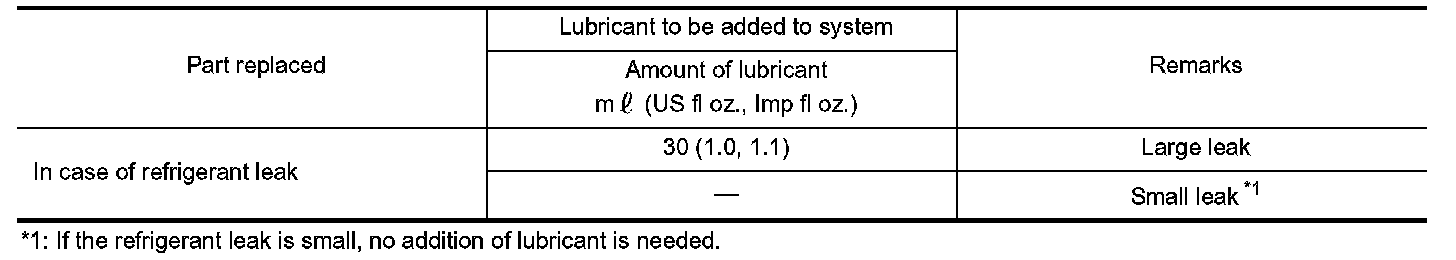 The lubricant in the compressor circulates through the system with the refrigerant. Add lubricant to compressor when replacing any component or after a large refrigerant leakage occurred. It is important to maintain the specified amount.