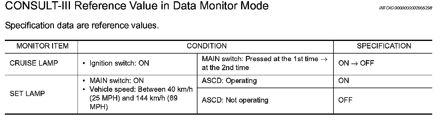 - SET/COAST switch on ASCD steering switch is turned ON while vehicle speed is within the range of ASCD setting.
